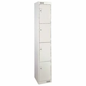 Four-door locker providing secure storage for personal items. Pre-assembled, all-steel construction with BioCote anti-bacterial coating, deadlock and 2 keys as standard. Light grey body with grey door.