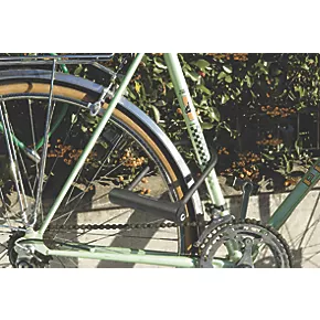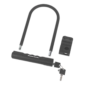 10cm wide hardened steel body for maximum strength and reliability. The 12mm diameter double-locking shackle is 20cm long and made of hardened steel, offering extra resistance to prying, cutting and sawing. The disc key cylinder prevents picking. Supplied with carrier bracket.