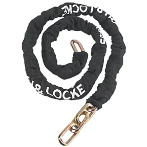 Weather-resistant, zinc-plated, hardened steel chain. Hexagonal shackle for increased security. Oxford cloth cover prevents scratching. Suitable for many applications such as securing bikes and motorcycles.